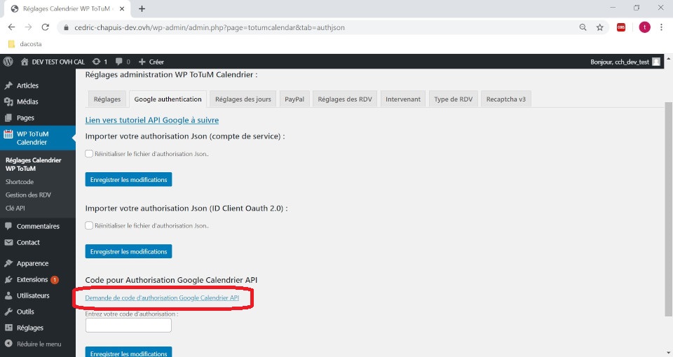1 – Dans le Back-end, dans les réglages du plugin, sous l’onglet “Google authentification” cliquez sur “Demande de code d’autorisation Google Calendar API”